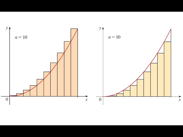 舉個例子,若我們要求下方圖形的面積,我們將它切成十份,左圖將長方形放在線上,因此面積會高估,即上黎曼和,其面積和可以表示為 $\displaystyle U_{10}=\sum_{i=1}^{10}f(x_i) \cdot \Delta x$(長方形面積 = 長 × 寛);右圖將長方形放在線下,因此面積會低估,即下黎曼和,其面積和可以表示為 $L_{10}=\displaystyle\sum_{i=1}^{10}f(x_{i-1}) \cdot \Delta x$。