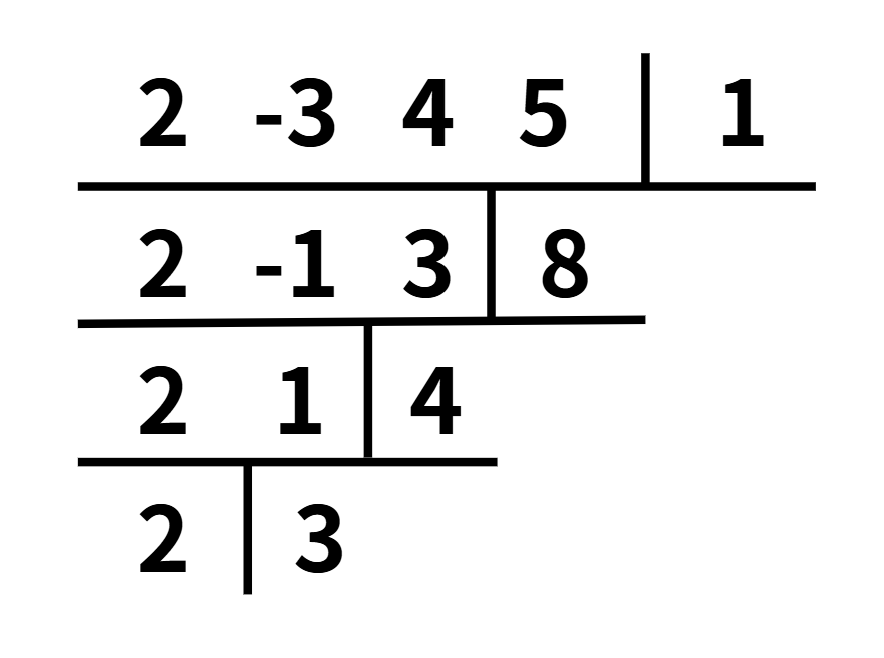 要把多項式轉為泰勒形式,我們可以採用高一上就教過的連續綜合除法。舉個例子,若我們要做「$2x^3−3x^2+4x+5$」在參考點 $a=1$ 處的泰勒展開: