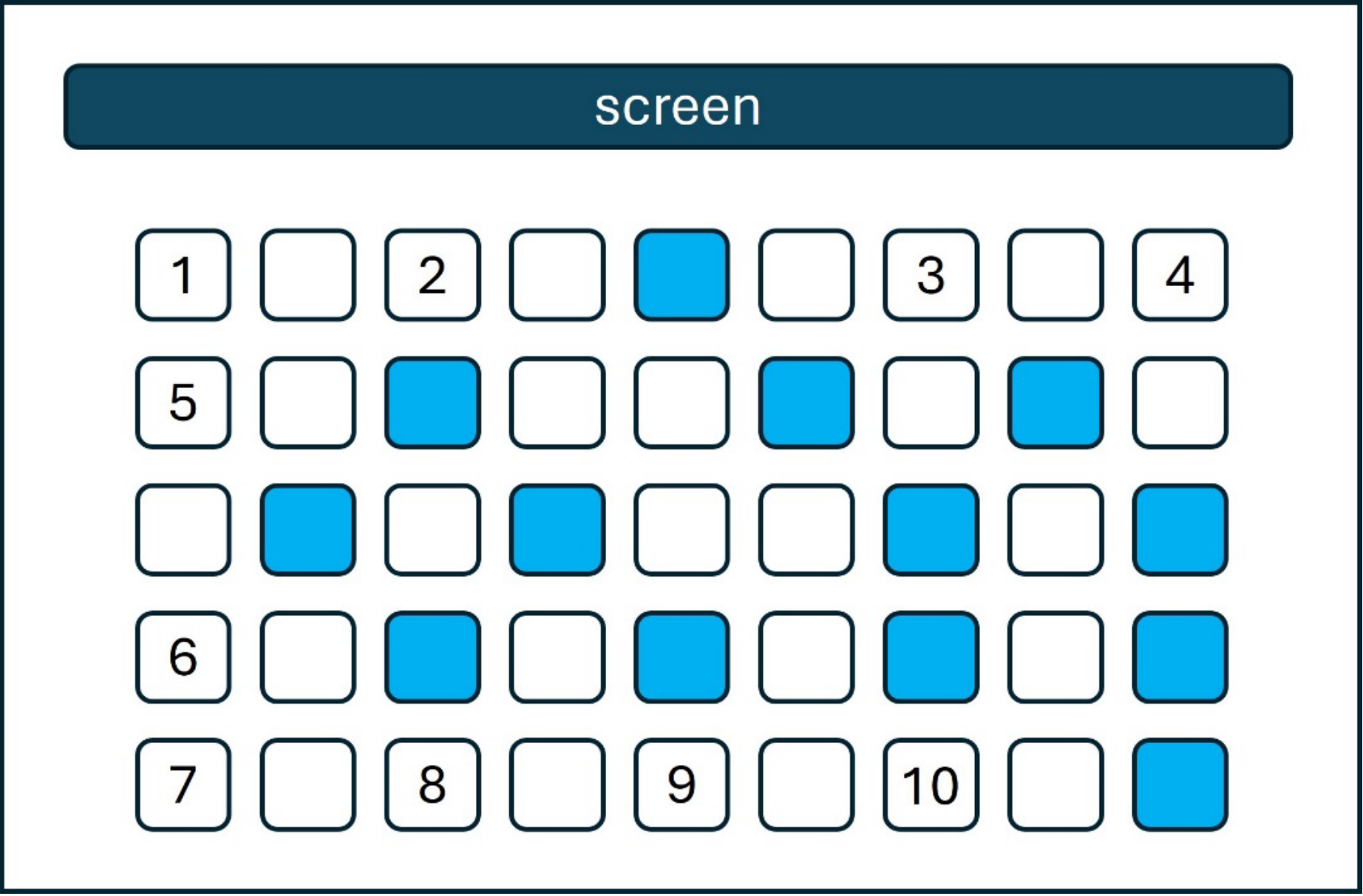 - 以下圖為例,影廳有 5 列,每列有 9 個位置,填色區塊為散客已預訂座位。依照防疫規定,最多可容納 10 位的團體客人,位置如圖數字標記處。
